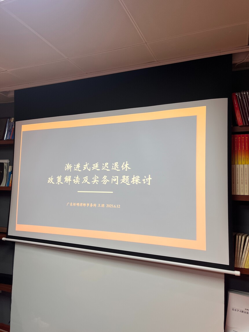 怀明新闻|2025年怀明所第五期“星期四律师沙龙”活动圆满结束时间:2025-06-13 2025年6月12日晚,怀明律师事务所成功举办了第五期“星期四律师沙龙”活动。 本次活动分为两个环节:党建学习和主题沙龙。在党建学习环节中,党支部书记钟烨带领与会人员学习了《求是》杂志发表的习近平总书记重要文章,并深入学习了习近平总书记在河南考察时的重要讲话精神。 随后,沙龙围绕《渐进式延迟退休政策解读及实务问题探讨》展开。主讲人王玥律师详细解析了新政核心内容,包括退休年龄分阶段延迟、养老金缴费年限逐步提高至20年,以及弹性退休制度的操作要点。活动中,与会律师结合案例探讨了政策落地可能面临的实务问题,如用人单位操作流程、劳动合同终止争议等,并提出了合规建议。