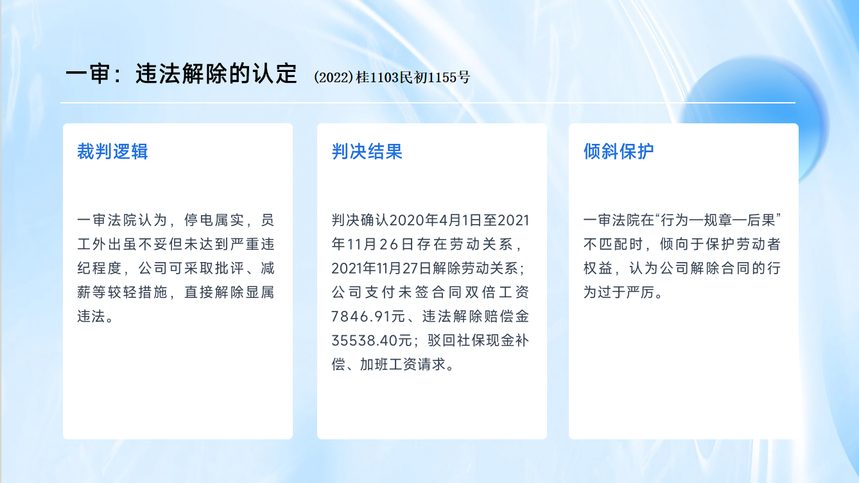 张娇娇律师以“左某杰案”为例,梳理了案件背景:员工因停电期间外出就餐被公司解除劳动合同,随后主动手写“开除通知”要求公司盖章,引发双倍工资、社保补偿及违法解除赔偿金等多项诉求。她重点分析了一审与二审的判决差异:一审认定公司违法解除,二审则因员工主动提出解除而改判为协商一致解除,赔偿标准随之变化。